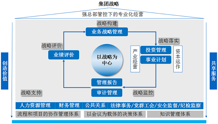 集团管控:“强总部管控下的专业化经营”=1个中心+5个环节+3个体系